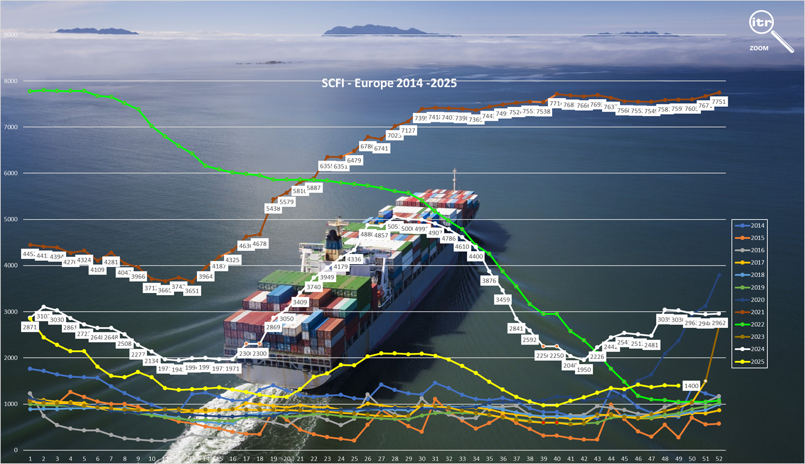 ITR intro: Med fredagens repetition af forrige uges $72 stigning i SCFI Europe indeks bør varsling om GRI pr. 1/12 være afværget ligesom den blev i august efter varsling af GRI pr. 1/8.