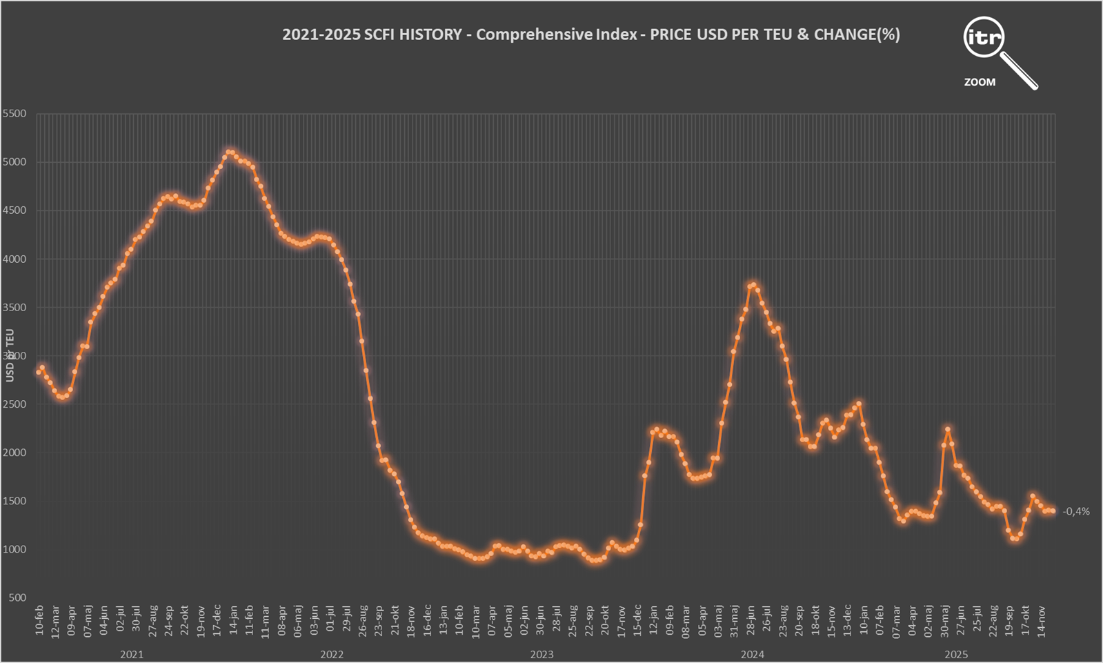 ITR intro: Baseret på udvikling i SCFI indeks i bl.a. 2022 og 2023 omkring Black Friday, synes konklusionen at være, at omtalte dag/uge, ikke kan påvirke containerraterne. Når det gælder søtransport, skal der mere til. Selv transport af varer hjem til julehandlen kan ikke aflæses i SCFI indeks. Som før nævnt har efterspørgslen på fragt for lille en kraft i forhold til vækst i udbud.