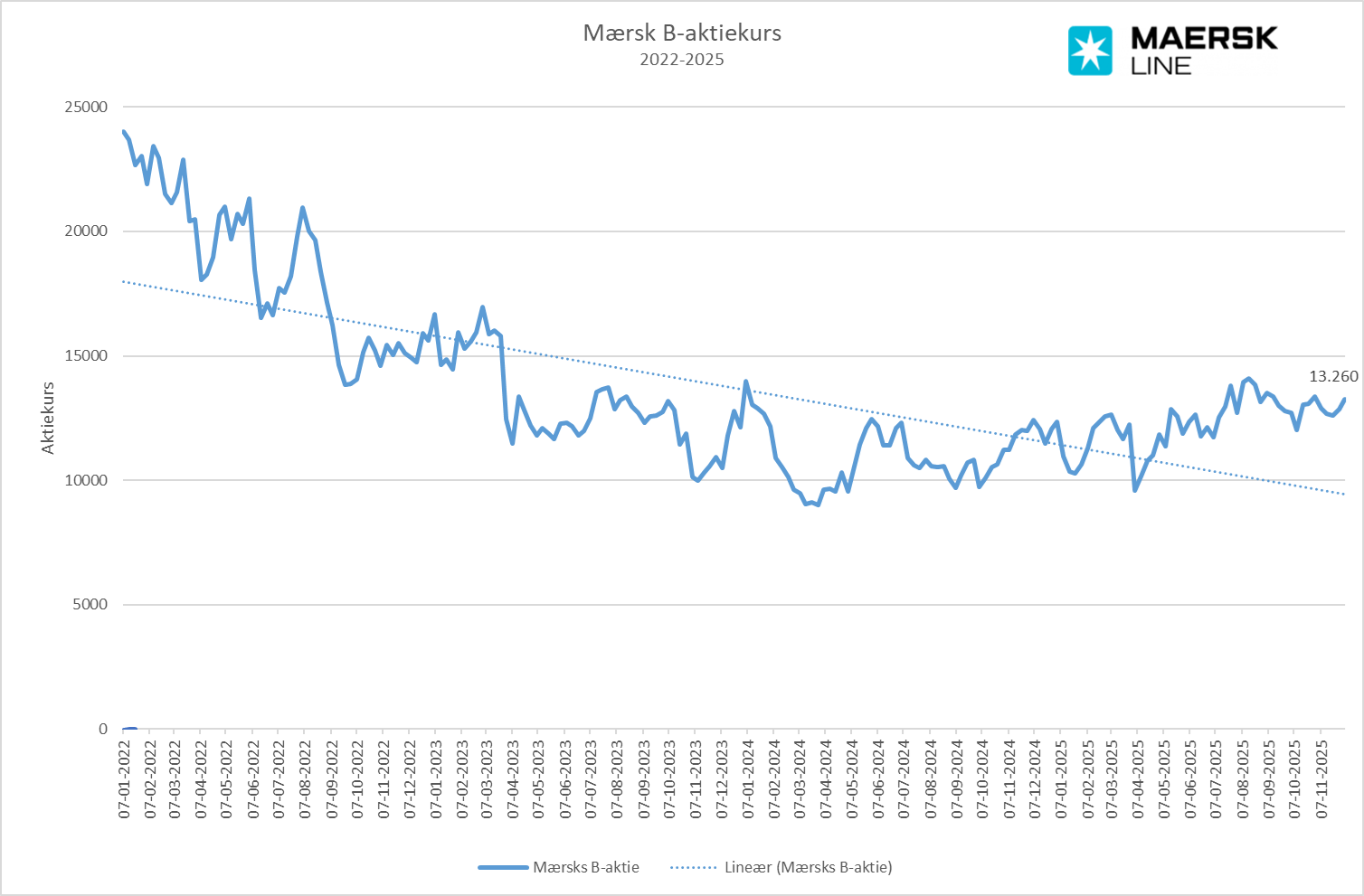 Mærsks B-aktie faldt fredag 10,9% til 11.430(fra før 12.825) i forhold til 1 uge før. Se historik nederst.