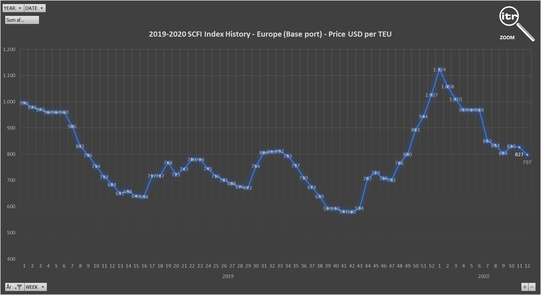 ITR intro: Mens spotrater på container-søtransport til Europa falder for 3. uge i træk, stiger pris på luftfragt på selvsamme import. Sidstnævnte stigning sker på baggrund af meget lave rateniveauer til og med 3. kvartal og en naturlig stigende efterspørgsel i 4. kvartal.