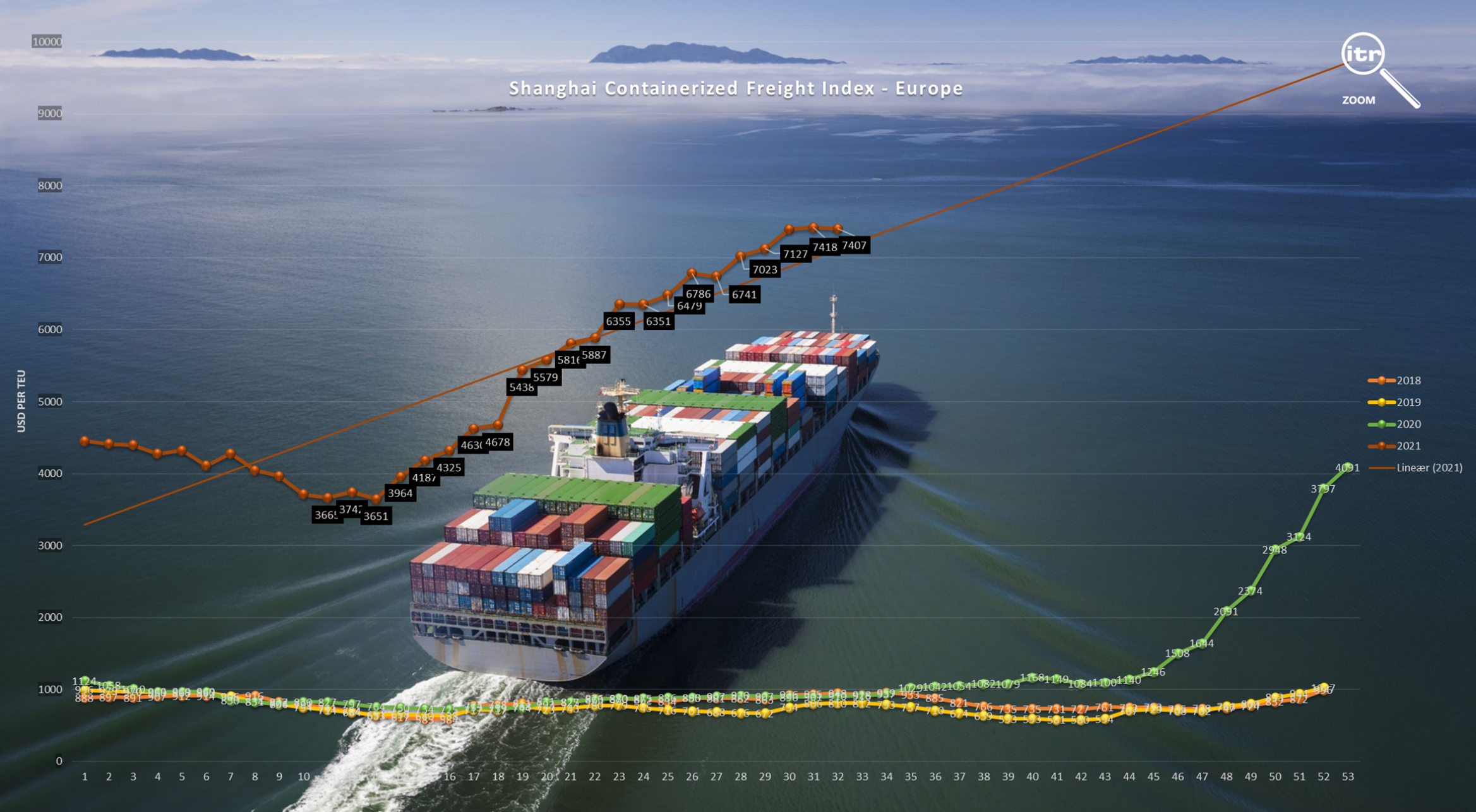Spotprisen på containerfragt fra Asien til Europa steg med $232 (8,08%), så pris er $3103. SCFI's Comprehensive indeks, som måler spotpriserne på containerfragt fra Shanghai til en stribe destinationer verden over, steg 16,3%.