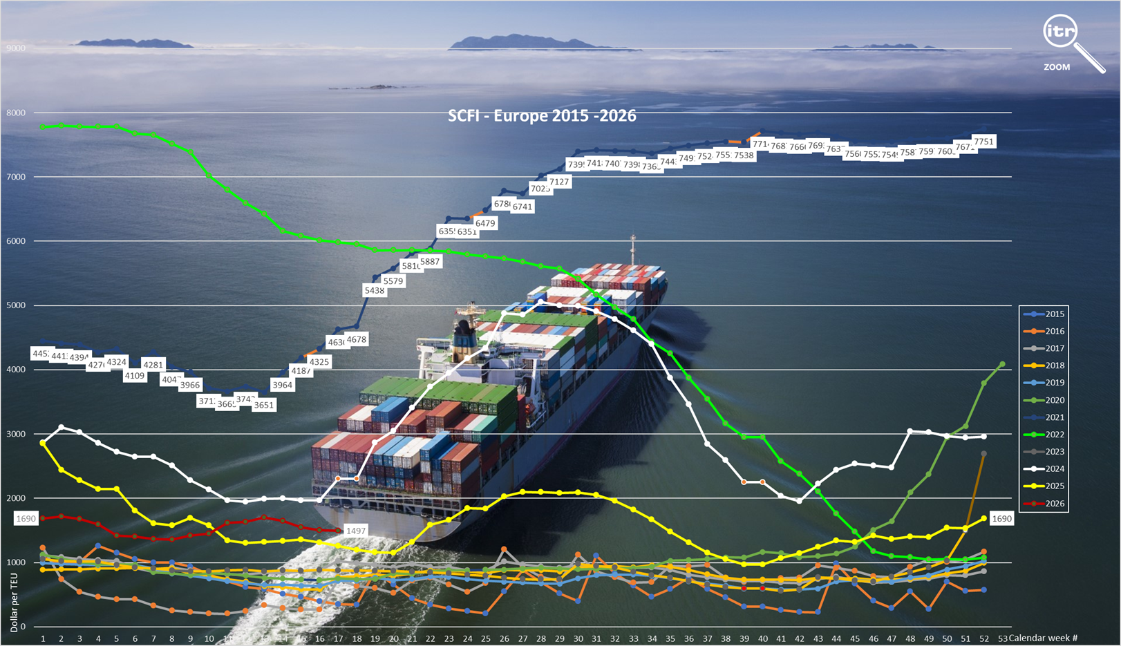 Spotprisen på containerfragt fra Asien til Europa faldt med $34 (4,5%), så pris er $722. SCFI's Comprehensive indeks, som måler spotpriserne på containerfragt fra Shanghai til en stribe destinationer verden over, faldt 3,5%.